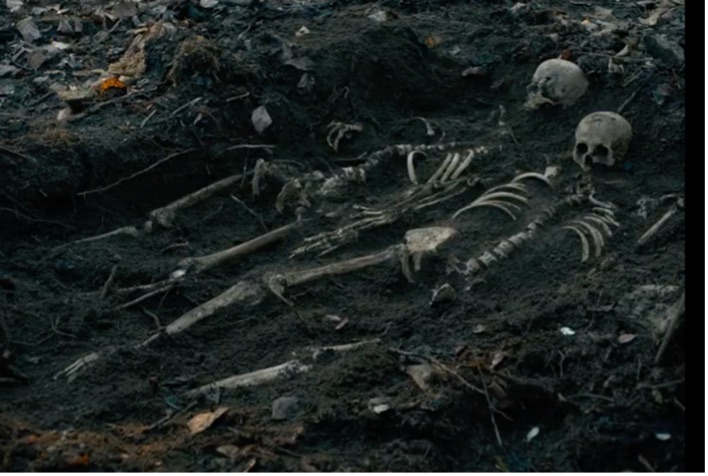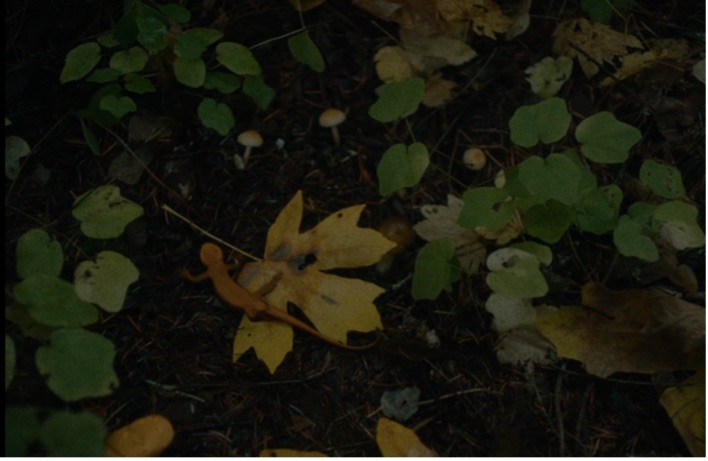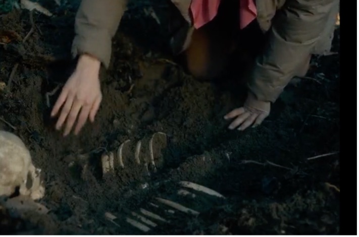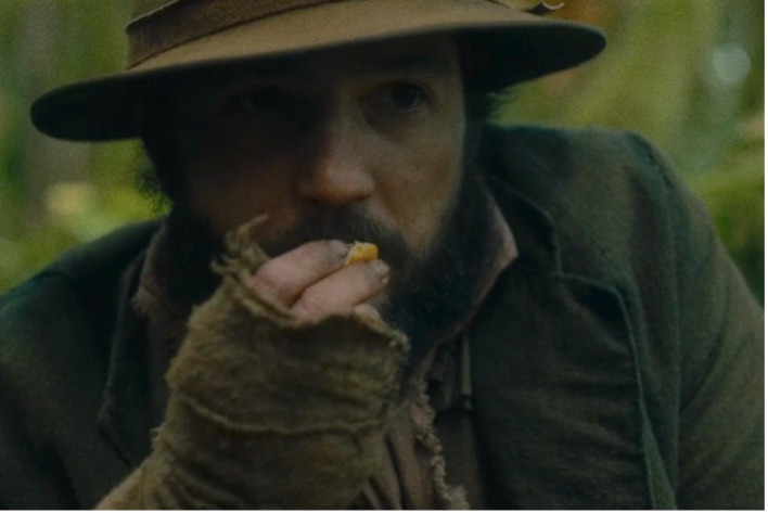 This is apparent in the film's opening scenes, where a contemporary industrial container ship drifts slowly down the Columbia River in Oregon (fig. 1). Set against an idyllic landscape, the minute-long scene introduces us to the rhythmic inner life of the story, unfolding at a contemplative and decelerated pace. The cargo ship is framed by the visceral acoustic image of waves lapping against the shore and the vessel's engine. This uneventful scene offers time to (re)focus our attention on the interplay between the soft sound of water and the mechanical sound of the barge, which carries into the next scene; a long shot of a dog sniffing the riverbank. Reichardt's camera, always at ground level, captures the dog's owner, a modern woman in a nylon jacket, as she studies the soil, unearthing seeds and sticks. In a subsequent shot, we see the dog discover a skull. Although ordered away, he remains within sight and sound as she continues digging, revealing two human skeletons buried closely together, echoing a chthonic story of intertwined lives (fig. 2 and 3). This chthonic logic transitions us back to the film's colonial past, introducing the main character, Cookie, a mild-mannered man in his thirties, as he wades through a dense forest, a Western imaginary of what colonists expected to be paradise: fertile soil and crystal-clear water. The camera focuses on Cookie's worn mittens and fabric, absorbing the passage of time, as earthy sepia tones of green, brown, and red encapsulate him, blending his features with the ecology, emphasizing symbiotic kinship (fig. 4). He carefully picks chanterelles, placing them in his scarf before tasting one. A gentle piano melody adds nostalgia, transforming the scene into a spatial stage extending beyond the canvas. The idea of creatureliness finds full expression when Cookie’s hand rescues a lizard, heightening the connection between human and non-human lives, illustrating an embodied understanding of mutual survival (fig. 5). Through its visual language, First Cow compels the audience to engage with the entangled lives that form the backdrop of settler-colonial narratives, subtly critiquing anthropocentrism and advocating an inclusive understanding of agency across species.